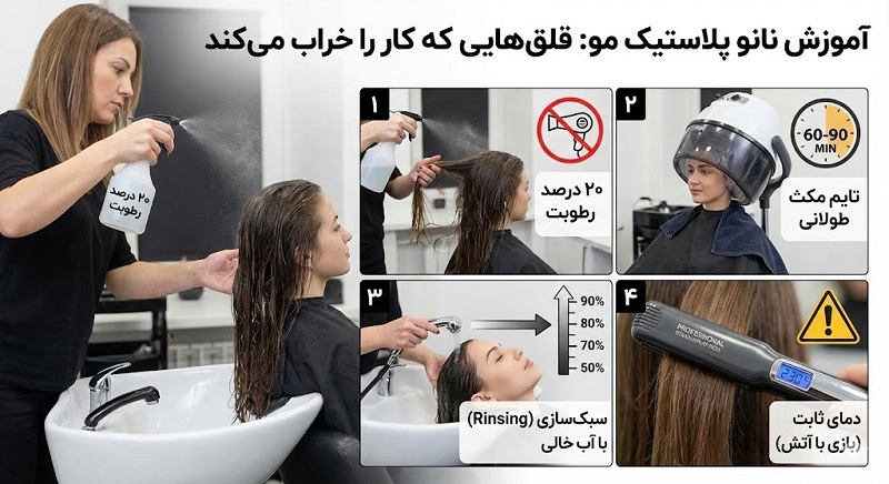 شاید فکر کنید چون مواد گیاهی است، کافیست بمالید به سر و اتو کنید. اتفاقاً برعکس! اجرای نانو پلاستیک مو یکی از تکنیکیترین و "بدقلقترین" کارهای سالن است. بیشتر نارضایتیها (مثل "موهام سوخت" یا "صاف نشد") مالِ مواد نیست، مالِ دستِ آرایشگر است. بیایید مراحل را با نکاتی که معمولاً گفته نمیشود مرور کنیم.