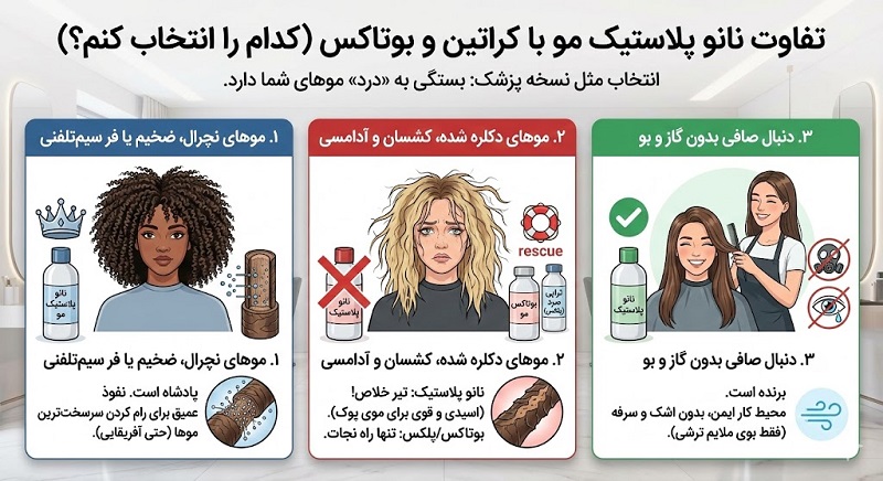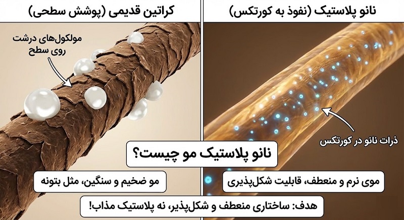 اینجا نانو پلاستیک حکم تیر خلاص را دارد! نانو پلاستیک ماهیت اسیدی دارد و اسید برای مویی که خودش در اثر دکلره پوک شده، قوی است. برای موهای آسیبدیده، بوتاکس مو یا تراپیهای سرد (پلکس) تنها راه نجات است. نانو پلاستیک برای مویی است که هنوز "جان" دارد.