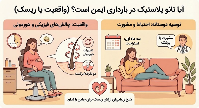 توصیه دوستانه ما در اسپرو این است: با اینکه نانو پلاستیک ایمنترین گزینه دنیاست، اما در دوران بارداری (مخصوصاً سه ماه اول) به خودتان استراحت بدهید. یا حداقل حتماً با پزشکتان مشورت کنید. هیچ زیباییای ارزش کوچکترین ریسک برای جنین را ندارد.